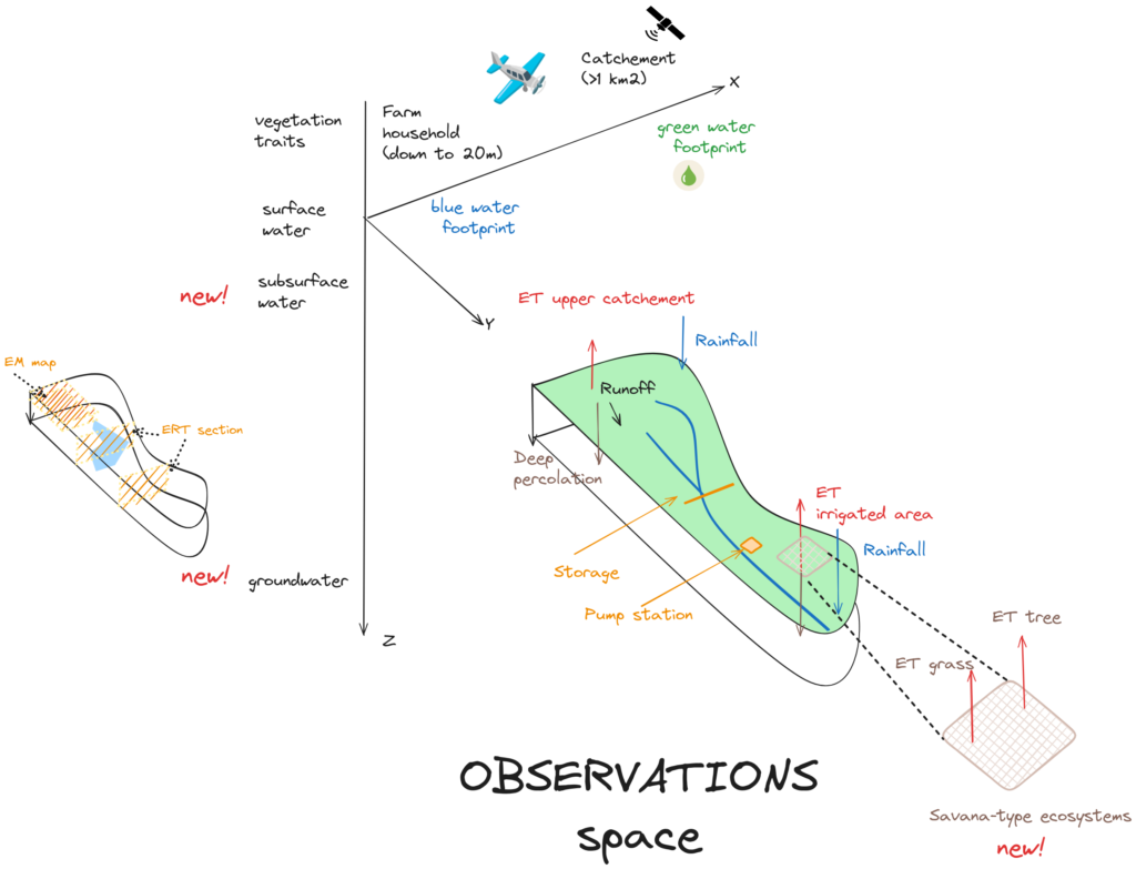 Integration of hydrological models, EO-based evaporation/transpiration, and geophysical subsurface parameters to distinguish blue/green water.